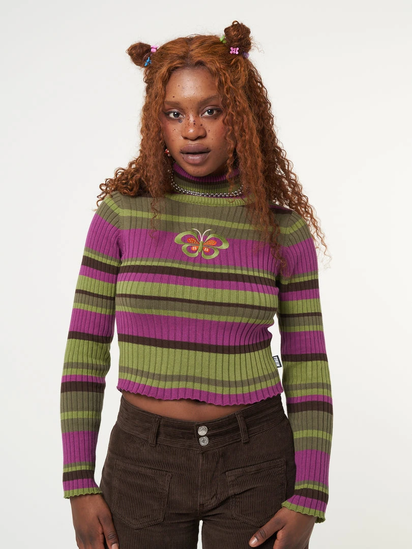 Minga London Clothing Butterfly Orchid Striped High Neck Ribbed Top